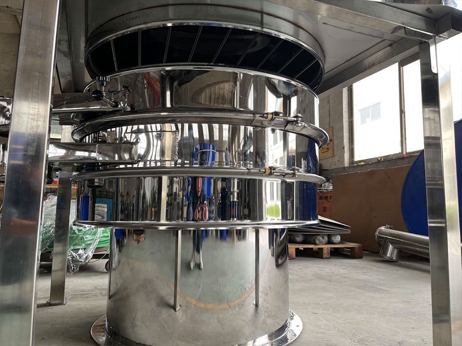 Then the material enters the vibratory screener​, and the vibrating motor drives high-frequency vibration to promote the uniform distribution and rapid flow of the material, and intercept large impurities or particles that do not meet the specifications in the material, so as to ensure that the compliant particles are discharged to the next process in an orderly manner, ensuring production continuity and product quality.